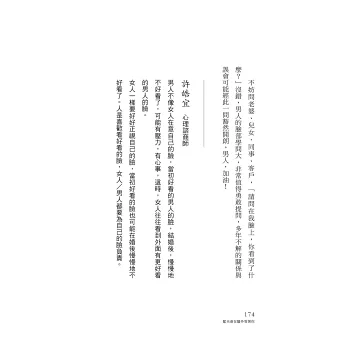 女人一樣要好好正視自己的臉,當初好看的臉也可能在婚後慢慢地不好看了。人是喜歡看好看的臉,女人/男人都要為自己的臉負責。──心理諮商師 許皓宜