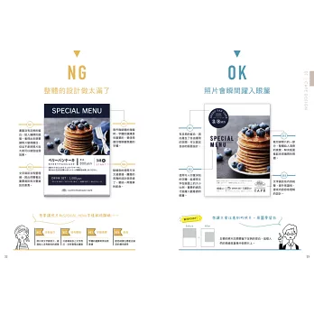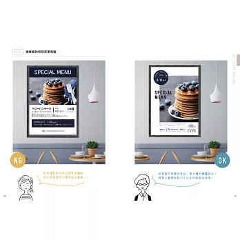 許多人在開始做版面設計時,只要畫面上有空白處就會不禁地想要填滿它。為了填滿空白,而將文字字級放大、在區塊內塞滿資訊,但這麼做就不是清楚而易讀、設計高雅的版面了。為了將想傳達給讀者的資訊傳達得更好,要留下空白,如此一來就能大幅提升設計的質感。不要害怕留白!只要活用留白部分,就能做出更清楚、更高雅的版面設計!