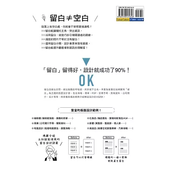 本書為著重在如何運用「留白」為主題的版面設計書,包含海報、傳單、POP、宣傳手冊、剪報資料、公司簡介、名片等等,用各種各樣的範例介紹解說設計的NG/OK,對於運用留白的方法、排版、選擇字體、配色等等,從各種角度做出確切的建議,將普通的設計變成時尚的設計,揭載立刻就能使用的留白設計訣竅。