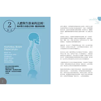 本書最重要的一章,便是教讀者運用簡單幾個步驟來調整身體,讓你了解如何用肌肉和結締組織來支撐脊柱、肩膀、髖部。以及,如何用天生的方式呼吸(經由橫膈膜),而這種腹式呼吸對身心健康的重要性,已明顯到無需多說。