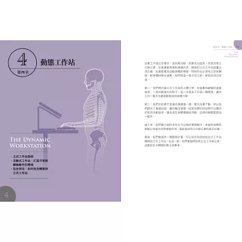 工作占去我們醒著的大部分時間,因此,透過站立工作來刺激身體多動成了最重要但也最艱難的一點。要如何做到這一點?本書提供必要的指引,從立式工作站的身體力學到幾種有效協助讀者適應站立工作的站姿,從工作桌的選擇到合適的鞋子,協助讀者一步步循序漸進地轉換。