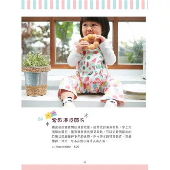 圍兜及嬰兒鞋等小尺寸作品,機縫、手縫都能完成。不論是媽媽想在育兒、家事的夾縫中放鬆製作,或是縫紉初學者想快速獲得成就感,本書中收錄了好做又可愛、成長階段都會用到的作品。