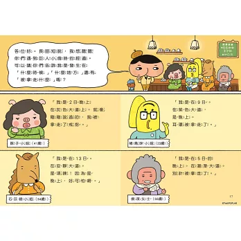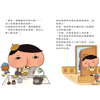 將橋樑書文圖並重、互搭的特色發揮得淋漓盡致的【屁屁偵探讀本】,不時在插圖中穿插對話,補充正文的細節,也增加閱讀的樂趣,這與一般以文字為主的故事分行分段、條理清晰依序呈現的方式大不相同,「哪句話先說的?」「這句話是誰對誰說的?」「為什麼說這句話?」……需要小讀者動腦思考其間的脈絡,對於閱讀理解與表達的邏輯是很好的練習。