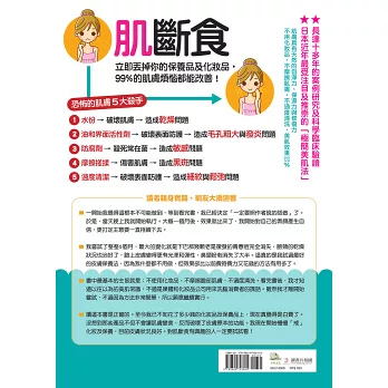 ‧讀這本書是正確的。至今我已不知花了多少錢的化妝品及保養品上,現在真覺得是白費了。沒想到那些產品不但不會讓肌膚變美,反而破壞了皮膚原本的功能,讓它變得必須依賴保養品才能「正常」,簡直就像毒品一樣。我現在開始慢慢「戒」化妝及保養,目前皮膚狀況良好。對肌斷食有興趣的人一定要試試看!