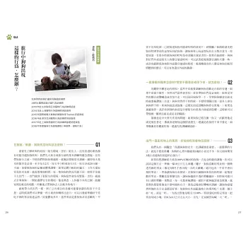 帶狗狗旅行時,若是遇到一些狗狗行為上的問題,例如,狗狗在旅館或餐廳失控吠叫、爆衝停不下來、亂吃地上的東西,或是突然跟別人的狗打架等等,該怎麼辦?發生狗狗暈車/船/機、中暑、誤食毒物或外傷,該如何緊急處理?作者特別專訪寵物行為訓練師和獸醫師,讓毛小孩爸媽在行前做好功課,避免突發狀況時措手不及。