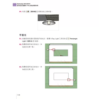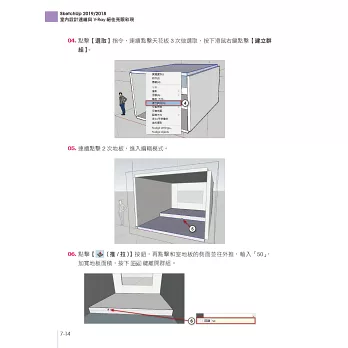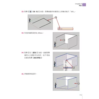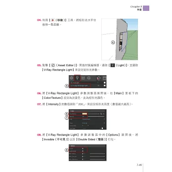 ‧繪圖密技:超完整的SketchUp必備技巧,包括:圖形繪製與編輯、模型繪製、材料與貼圖、圖層管理器、攝影鏡頭、風格樣式與V-Ray渲染擬真…等。