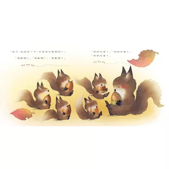 秋天到了,松鼠媽媽帶著小松鼠們到森林裡採集橡果,