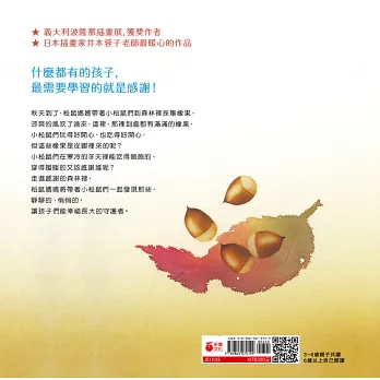 從松鼠媽媽帶著小松鼠到森林採集松果的故事裡,井本蓉子老師讓孩子看見了,原來餵飽小松鼠們的果實,是那些不曾見過的人,所為牠們栽種下的。