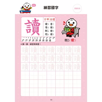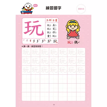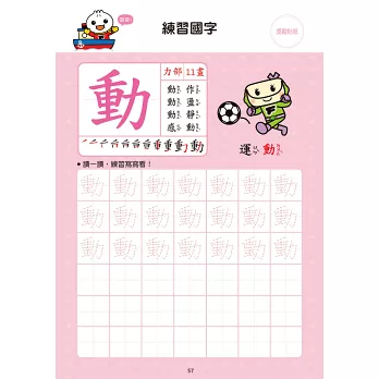 練習寫62個國字,可愛的圖片加上正確筆順,讓孩子在練習寫國字的同時,增進運筆能力。