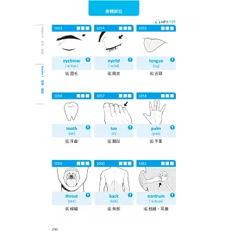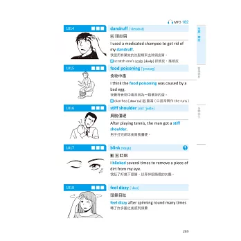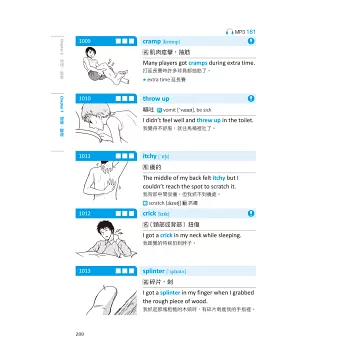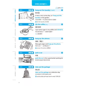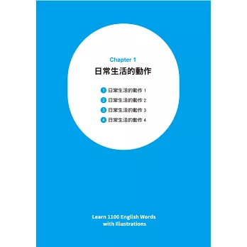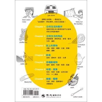 書中把生活中常見的「物件」和「動作」,用漫畫圖解的方式,分門別類細分七大主題,像是訓練狗大小便(housebreak one’s dog)、將襯衫扣上釦子(button up one’s shirt)、舊衣服(hand-me-downs)等1100個字。每組字彙都錄製了美式發音MP3,並提供例句及相關字作為延伸學習。