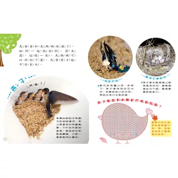 鳥類是年紀較小的孩子不容易觀察的對象,因為鳥類移動速度快,觀察距離通常也較遠。本書利用闖關的方式,加上有趣的紅色濾鏡原理,讓孩子從鳥類的身上得到有趣小知識。從鳥類的巢型態觀察,再到鳥類嘴巴多樣性與食性的關係;最後以孩子們常常觀察到的麻雀為探討對象,我想是很棒的安排。