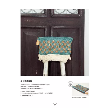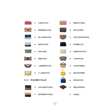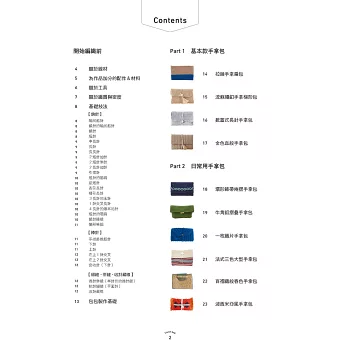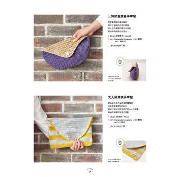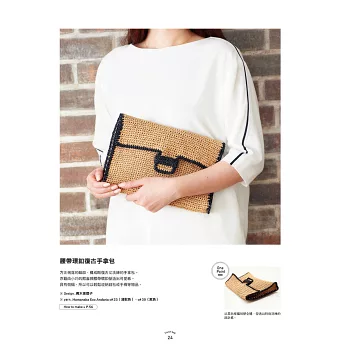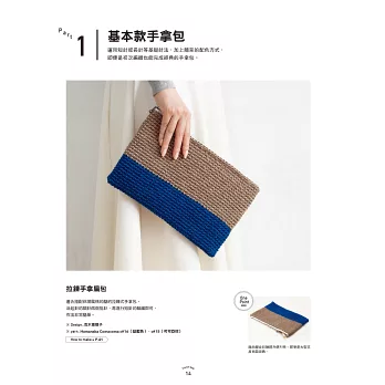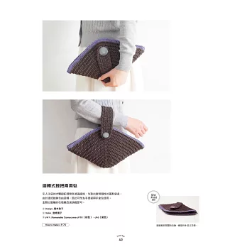 近年來掀起的小包風潮,讓復古的手拿包再次成為時尚寵兒。不僅適合作為日常外出的隨身包,亦可當作大包裡的收納包。想要臨時外出或離開座位時,也不怕貴重物品無處可放。本書集結8位日本人氣編織創作者,精心設計30款典雅中兼具活力,用色亮眼又不失大人風情的手拿包。使用輕巧的麻線與嫘縈手織線材,結合亮面與霧面的線材特質,打造簡潔卻豐富的包款面貌。運用巧思,加上背帶變身斜背包;兩摺的袋身展開即為扁包等。各式美麗又實用的手拿包盡在本書!