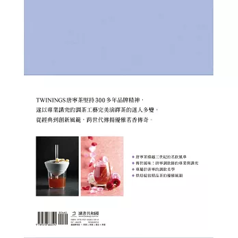 書中收錄了世界盃「德國IBA慕尼黑甜點大賽」冠軍-楊嘉明主廚以唐寧茶為主軸設計的茶香甜點,以及世界級調飲大師Luca Cinalli的茶譜、TWININGS GRAND PRIX調飲大賽歷屆得獎茶譜,每一款都是獨特吸睛的鉅作。