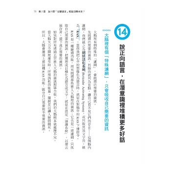 若能進一步養成說正向語言的習慣,在潛意識裡不斷累積美好、愉快的記憶,既存的負面記憶便會逐漸被擠壓到潛意識的下層去,目標就會更容易達成!