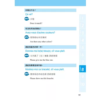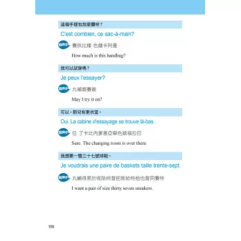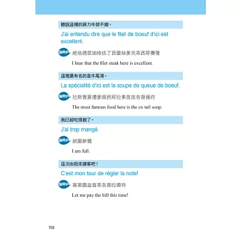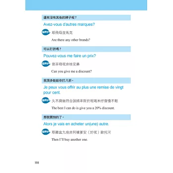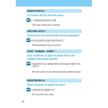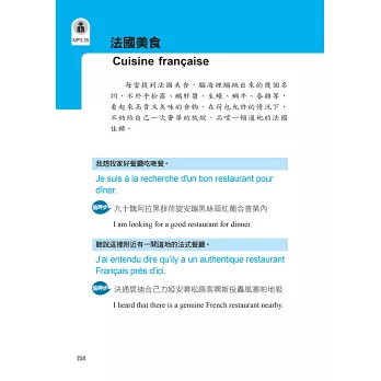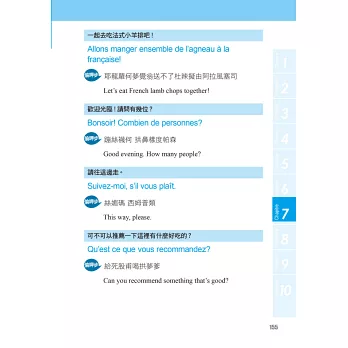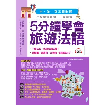 對話採中、英、法三語對照,加上中文拼音輔助,懂英文就能說法語,不懂英文的,只要會中文,也能說法語!
