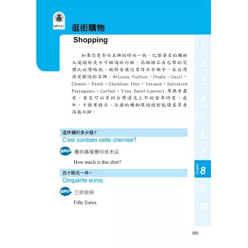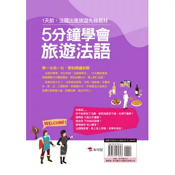 本書精選最簡單實用的會話,是專為準備赴法旅遊人士設計。輕鬆,無壓力的學習方式,赴法旅遊情境一應俱全,只要你想說的,裡面通通都有,隨翻隨說,到法國一直玩、一直買,吃喝玩樂,嗨翻天!