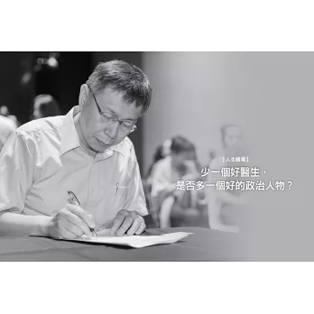 是人生的種種遭遇和行動,證明了我是誰,決定了我是怎麼樣的人。從柯醫師變成柯市長,我深深體悟,許多醫療問題出在,當醫生不再對病人的痛苦覺得不安;種種社會不信任則是源自,當為政者不再對人民的痛苦覺得愧疚。