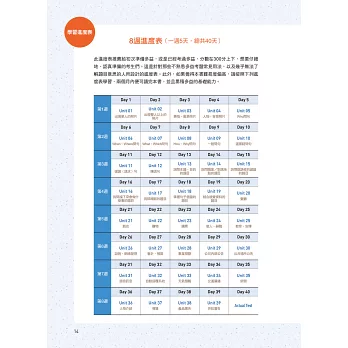 本書分別規劃了40天及20天的學習進度表,分別推薦給初次應考多益/初階程度以及非初次應考多益/中高階程度的考生。無論是想要仔細認真地準備考試,或是想要考前衝刺、直搗重點,只要跟著進度表學習,就能在時間內讀完本書,並累積考試實力!