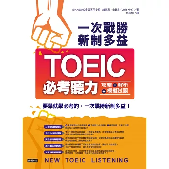 本書依照多益聽力考試順序進行規劃,分成照片描述、應答問題、簡短對話及簡短獨白,並分門別類整理出必考重點、聽寫訓練及模擬試題。只要跟著本書規劃,一步步循序漸進地學習,就能一次戰勝新制多益,考取理想分數!