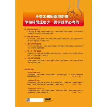 本書不惜成本採用全彩印刷,排版清晰好讀,並有層次地標示出必考重點。高級紙張不反光、不傷眼且易於書寫,此外,研究顯示提筆寫字能加強記憶力,邊讀邊寫筆記加深印象,學習效果最佳,如此一來便能提升閱讀速度,增加答題效率!