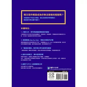 總覺得韓檢寫作的考試時間太短了嗎?別擔心,透過〈答題戰略step by step〉,協助同學依步驟拆解考題、建立高效率的解題思考邏輯,讓考生用最短的時間,順利掌握寫作方向!