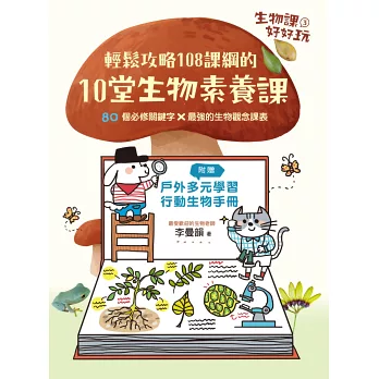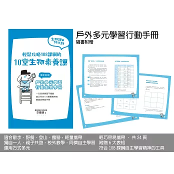 5‧行動版手冊因應108新課綱的跨學科學習方針,收錄「自然寫作」單元、「生物尋寶賓果遊戲」、「生物觀測表」等工具,讓孩子從親眼觀察、親手記錄開始學起,在遊戲式、探險式的情境中自然形成素養,扎實吸收知識,逐漸養成屬於自己的學習長久之道。善用台灣四季分明、地形豐富的特色,用探險精神到戶外上寶貴的生物課,也達到108新課綱的「素養」需求。