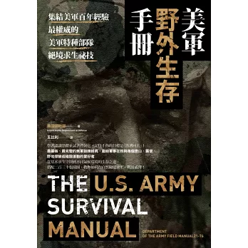本書為美國國防部編輯的陸軍部野外手冊,前半部分介紹野外求生的基本守則,包含個人或團體應該注意的求生要領、急救方法、通用求救訊號、定位、尋找水及食物、生火煮食等基本求生技能。後半部則個別介紹嚴寒、沙漠、叢林熱帶與海上地區應該特別防範的細節、如何搭建適合該地的庇護所、常見動植物,以及與當地原住民互動的基本準則。內容廣泛兼具正確性,是想要了解野外求生術的必讀之書。