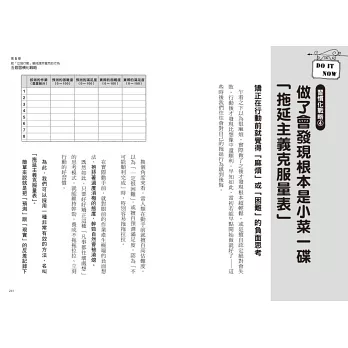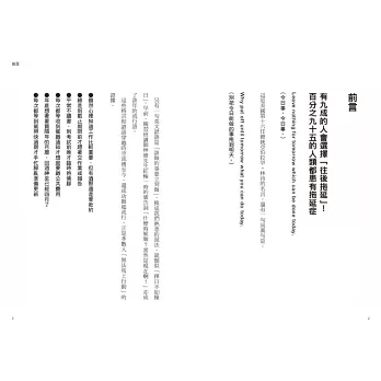 相信大家在讀完這本書後,一定會用截然不同的角度來看待「往後拖延」的行為,培養出懂得踩著輕盈腳步衝刺的達人資質。