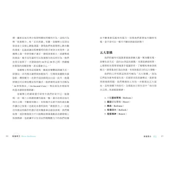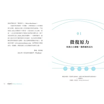 只要培養習慣善用這些技巧,就能量身打造適合自己、快速有效恢復活力的策略,並且迅速擺脫負能量。面對生活與工作的多重壓力,學會以習慣配合生理機制隨時善用微復原力的技巧,就能夠很快重新振作,迎向挑戰。