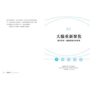 「本書循序漸進,不要求一下子改變,而是讓我們利用現有的資源,就能更專心、更有活力。」──華特•艾薩克森(Walter Isaacson),《賈伯斯傳》作者