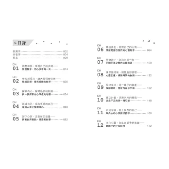 現在,劉院長集結多年診療的專業及經驗,完成這本「24週練習活化大腦改善睡眠」一書,書中精選12個章節案例,每個案例都分別從心理、運動、活動、飲食與藝術創作等五個向度說明改善睡眠的方式,最後還有實際練習的紀錄表格,這可以讓讀者在閱讀後,照表操課,實際檢視練習後的改善成效。
