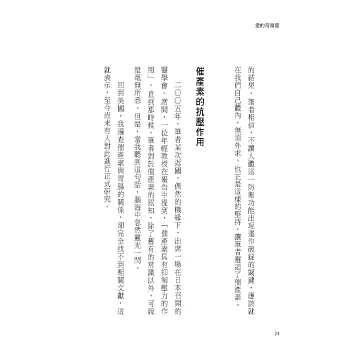 引用諸多研究與科學實證,印證腦內催產素荷爾蒙療法是對現代醫學束手無策的一線生機,治病可不必用藥醫,好好經營美好五感的日常生活小細節、散發愛的正能量、選擇喜愛的運動、宗教與靈修的助益……,種種的一點一滴的落實,其療效非藥物可媲美