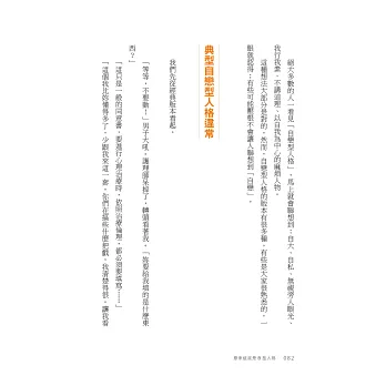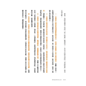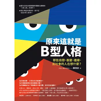 透過本書,不但能了解B型人格及所屬四個子人格的特質和外在表現,也能學會當自己或親朋好友是B型人格者時,該如何應對或提供協助;最終目標則是消除各自的缺點、凸顯專屬的優點,以達到與社會之間的和諧共存。