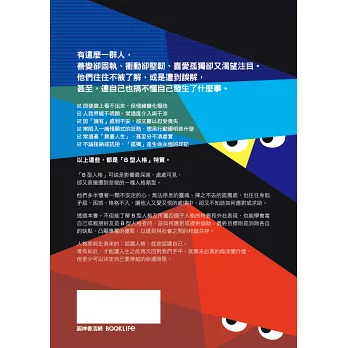 「B型人格」可說是影響最深遠、處處可見,卻又普遍遭到忽視的一種人格類型。他們多半懷著一顆不安定的心、無法停息的靈魂、揮之不去的孤獨感,也往往身陷矛盾、困惑、格格不入,讓他人又愛又恨的處境中,卻又不知該如何應對或求助。