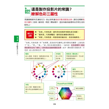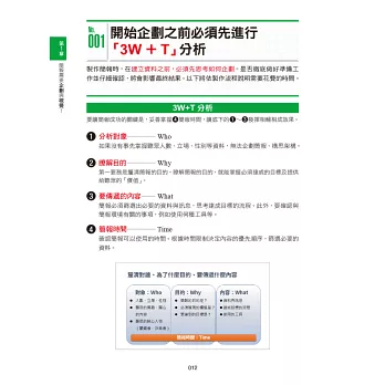 PowerPoint是一套非常容易上手的軟體。不過,是否了解箇中竅門,對於製作出來的成果,會有非常大的差異。本書沒有廢話,以簡單易懂的解說,明快地告訴您如何規劃投影片的製作、配色的基本技巧、表格與圖形的視覺化,幫助您製作出具有魅力的專業投影片。