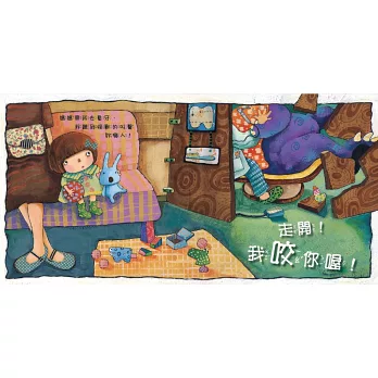 作者以簡單的文字描繪怪獸的語言和行為,插畫家則以濃烈的色彩和厚重的質感肌理,表現怪獸狂野的動作和情緒。作者和畫者刻意將一幅幅畫面,營造成像舞台劇的一幕幕演出,讓讀者跟著小女孩看到生活中相同的場景,以及熟悉的行為與對話,感受到怪獸就在眼前。