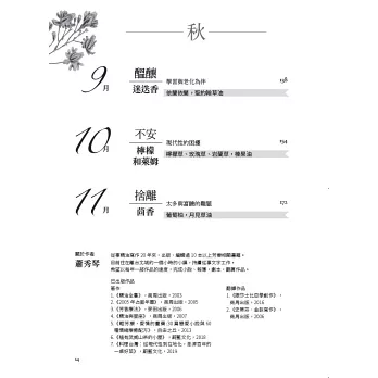 書裡的文字,從東方到西方,從希臘羅馬時代到現代的台語文學創作,我建議開始閱讀時,暫時把芳療理性的頭腦關閉,將爬蟲腦最原始的感覺開始喚醒。精油氣味的原身來自植物,而植物比人類更早存活在這地球上,要認識及善用精油,就要從植物,尊敬這些比人類更古老的靈魂開始,也是秀琴這本書很重要的脈絡。