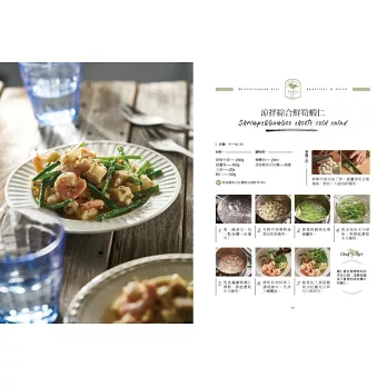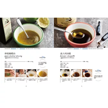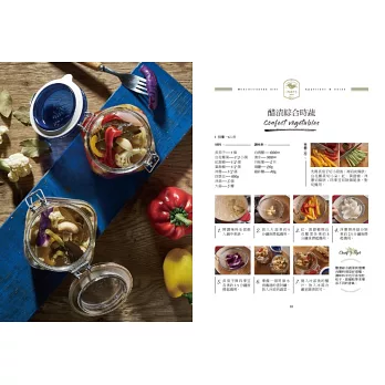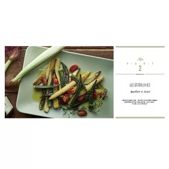 PART2前菜與沙拉:市面上的沙拉醬千篇一律,而且使用的各種不同的化學香料與成分,吃起來也乏味無趣,想要實行健康的地中海飲食計畫,當然不可缺少自製的沙拉醬汁囉!從簡單快速的檸檬橄欖油醬到風味十足的香蒜鯷魚醬,搭配隨手可得的四季蔬菜,爽脆的各種口感與滋味在嘴裡跳躍,餐餐吃蔬菜都沒問題!