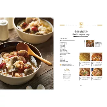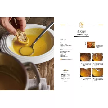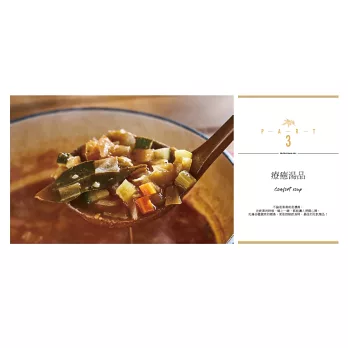 PART3 療癒湯品:台灣人的餐桌,怎麼可以沒有湯?主廚教大家先利用簡單食材,熬出美味的蔬菜高湯、雞高湯與海鮮高湯,再利用這些基底高湯,做出各種風味的湯品,學會這些基底高湯,隨心所欲,都能做出一鍋溫暖馨香的湯品。