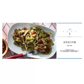 PART1沙拉醬料、基礎高湯、手做義大利麵與基礎醬料:學會這些基礎的基本醬料、高湯,搭配節令食材,竟能讓家裡的餐桌出現地中海風情料理,手做義大利面與醬料,更是每一天與家人相聚用餐的亮點,輕鬆、簡單,更重要的是,絕對健康!