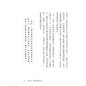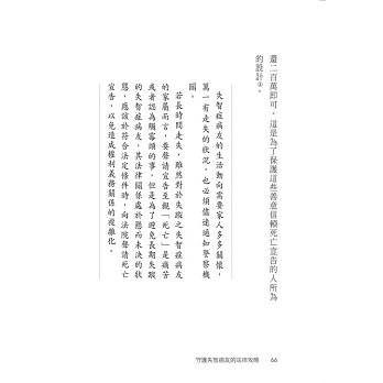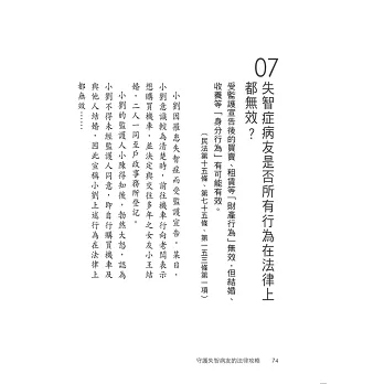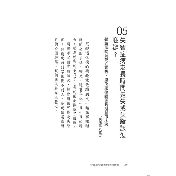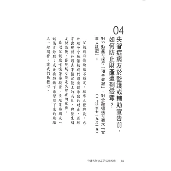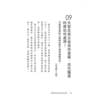 例如失智症患者涉及竊盜等犯罪行為時,法院可能免刑或減輕其刑;失智症患者的醫療同意權、扶養問題、勞動問題、失蹤乃至死亡宣告問題等。因此,即使事先已充分規劃、在財務方面安全無虞者,亦可藉由本書,對失智症患者可能涉及的法律議題,具備整體、概括的認識。