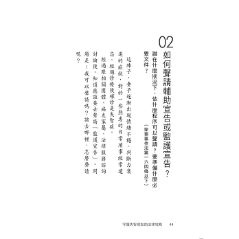 監護與輔助宣告係由法院審理,程序嚴謹,需耗費一定時日。本書注意到此問題,在第5則提供了預告登記與當事人註記的兩個方法,能較迅速保護失智症患者的財務安全。