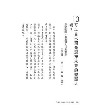 作者群具深厚的人權素養,以確保失智者當事人權利、照顧、自立為基礎,進行法律的支援。當我讀到一個受監護宣告的失智者,無法進行財務與訂定合約的行為,但只要有意思能力,仍可以自己決定要跟誰結婚時,不禁拍手叫絕。一般人通常會認為失智者既然已無行為能力,就什麼都不能主張了吧,但作者就是舉了個例子,告訴大家不是這麼回事喔。