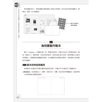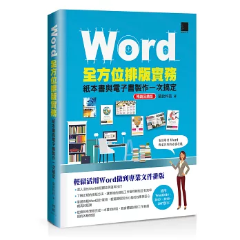 本書除了讓你對Word軟體的熟悉度達到精熟的地步,更著重在以Word做專業排版,目的是在協助你使用熟悉的Word軟體,來製作出一份具專業質感且又具效率的文件。因此,對於印刷流程、紙張開本、版面結構、裝訂裁切、文件類型、排版原則、頁面佈局、文字建構、樣式設定、範本製作、圖文編排、內容圖形化、快速修正錯誤等各項必備知識,從中歸納出許多簡單又實用的使用技巧和要訣,輔以實際範例解說,讓你一目了然、輕鬆上手。運用你所熟悉的Word功能,便能快速完成具專業水準的排版文件。