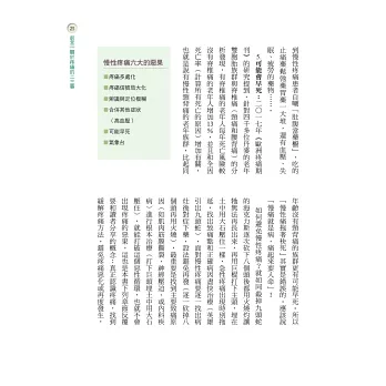 前作出版後承蒙國內外讀者厚愛,歐洲、美國、中國、東南亞都曾有患者表示讀此書受益,實在愧不敢當。然醫學研究進展一日千里,早先書中提到一些疼痛治療觀念,逐漸在個人基礎研究、最新醫學期刊發表以及診療經驗積累下更加清明。