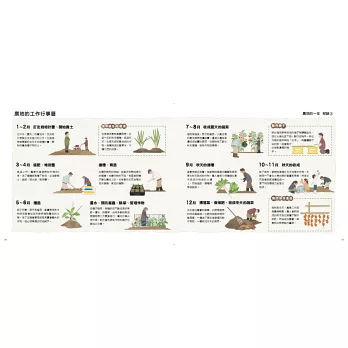 3.不只是繪本更是農人的工作實錄:畫面以自然環境全景構圖,搭配各種生物介紹圖像,詳細的解說一年四季的自然變化,書末附上一整年農地工作的行事曆,解說農地一整年的工作過程、各種農作物的圖鑑與成長階段、每個季節的工作內容,以及農事工作中所需的配備機具,讓孩子更近一步的親近山林、觀察農地生態。