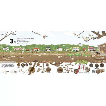 2.超細膩農地全景導覽圖:作者透過在定點做一年的生態觀察,帶領孩子發現超級驚人且各式各樣的田園生物,詳盡的解說搭配圖像,就像帶著孩子做近距離田野調查般,實地認識農地裡一年四季的變化,以及在田園間棲息的多元物種,包含各種昆蟲、鳥獸及草花,讓孩子吸收豐富且多元的生態知識,一次認識孕育許多生命的大地寶庫。