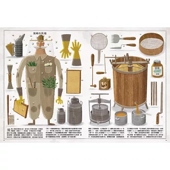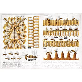 不要被這本書上蜜蜂卡通式的逗趣臉孔誤導,其實這本書的內容紮實,插畫精準、符合科學。海報式的插畫設計,占據了絕大部分的版面,主導了視覺風格。以「蜂王的生育任務」這個跨頁為例,繪者用8張插圖讓讀者了解蜜蜂的生活史和蜂王扮演的角色。巢脾的剖面圖清楚讓我們知道:蜂卵如何變成幼蟲,又羽化成蜂。