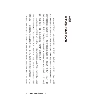 人生是漫長的旅行,也許是畢業旅行、渡假旅行、留學旅行、移民旅行。當你長大到外面求學工作的歲月越來越長,漸漸發現回家探望家人也變成旅行,短暫探望擦身而過,那是一場遙遠生命旅行的記憶。人生過程是無數旅行串連,童年的、青春的、工作的、戀愛的、求學的、婚姻的連接成漫長的生命旅行,當你步入中年,靜靜沉思,回顧一生記憶,發現人生是一段一段的旅行記憶,隱藏不同故事和風景。