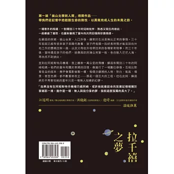 《拉千禧之夢》是疊合著不同時空的步調與節奏的作品,在作者看似輕鬆詼諧的語調中,展開了一個個封塵、斷裂許久的時光片段,在模糊的記憶裡按圖索驥的過程裡,探索被遺忘的人際連結,重新感受「離家」的遙遠,「返家」的艱難,以及各種埋藏在內心深處,有關「近鄉情怯」的違和、抗拒、曖昧的微光,讓短暫時光奇遇彷彿一場夢的嘆息,卻又成長深刻。